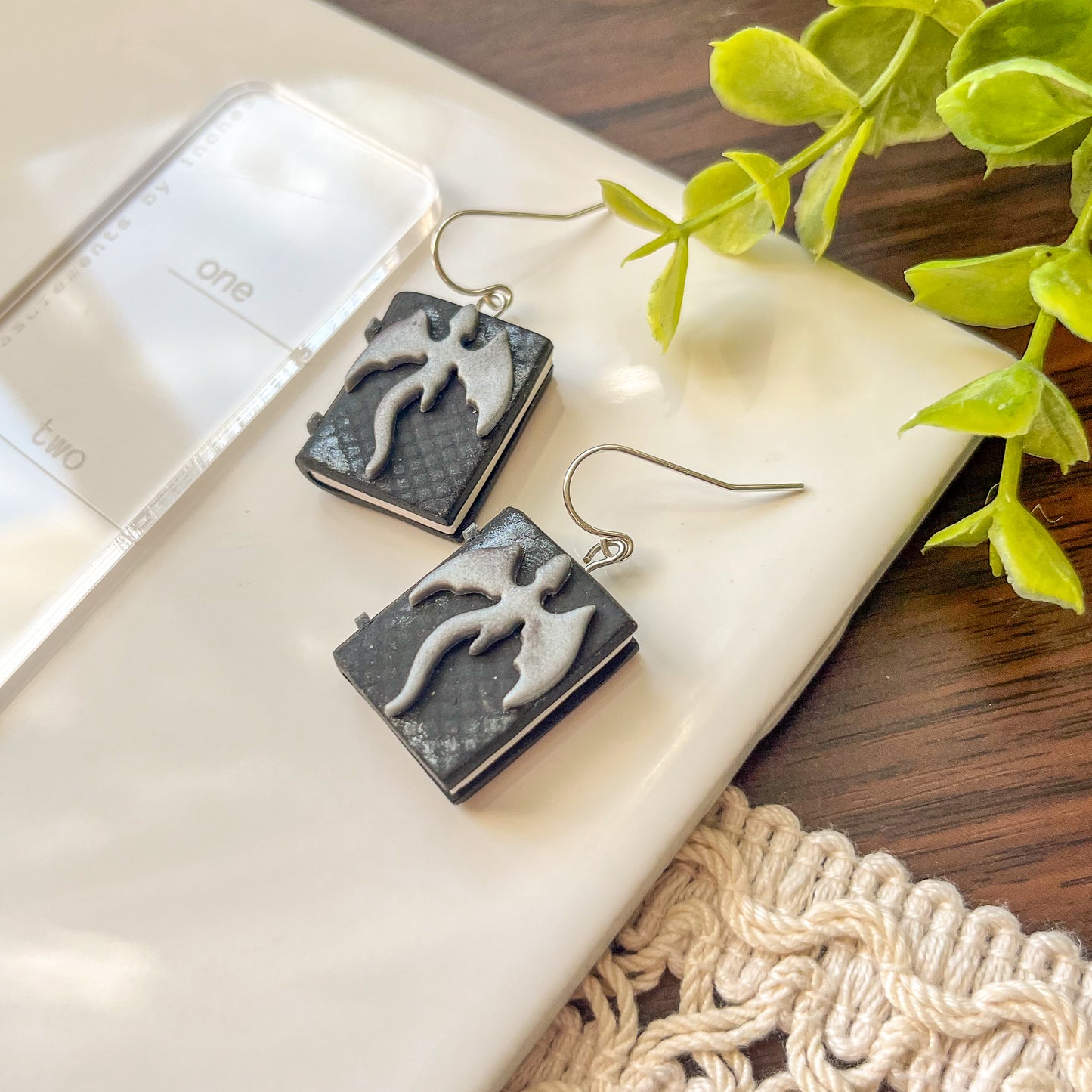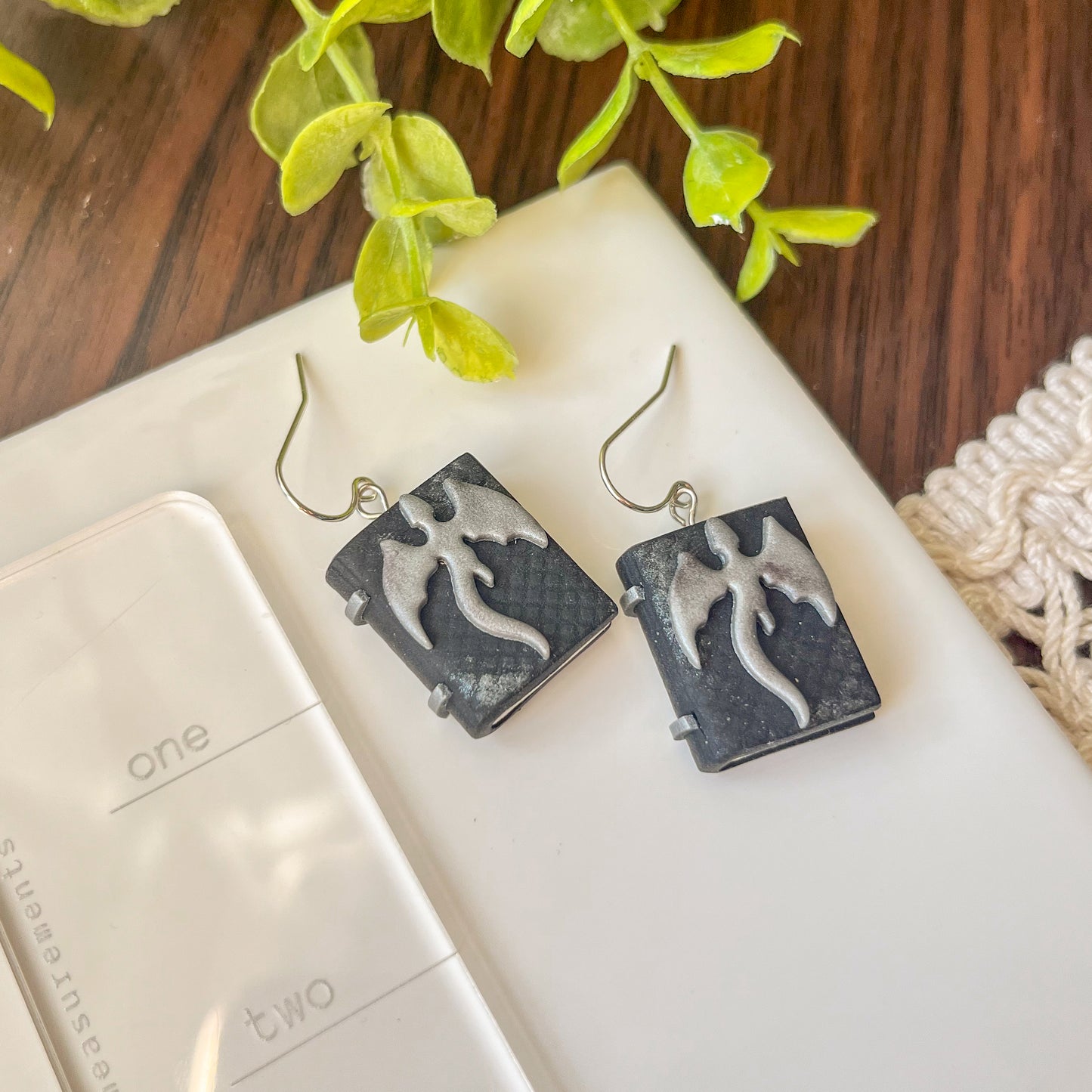 These earrings are about an inch long and feature a textured black book decorated with silver details and distressing, along with a matching dragon. They are an adorable style for any fantasy reader and featuring sterling silver findings, they are great for anyone who wants to wear silver