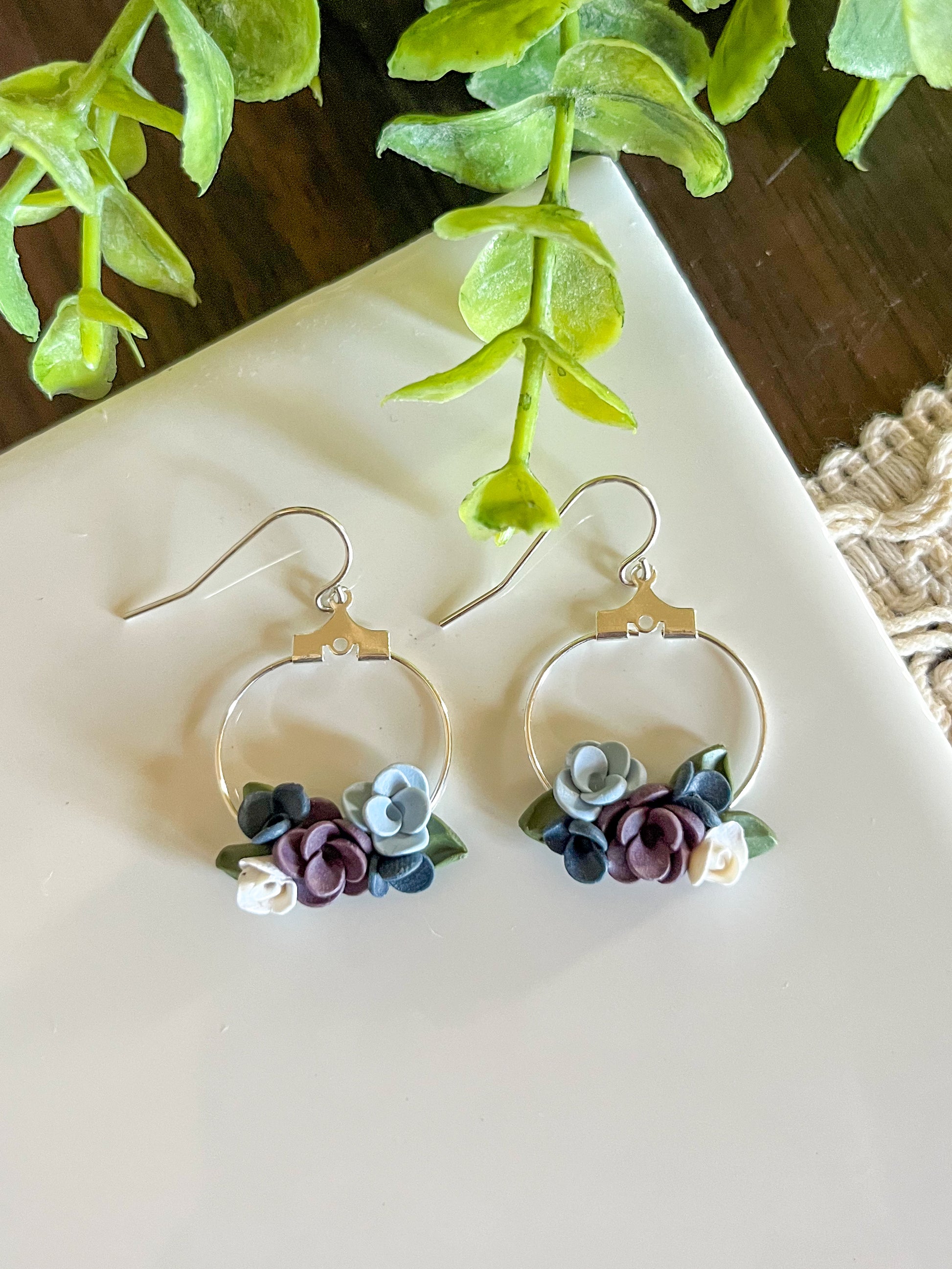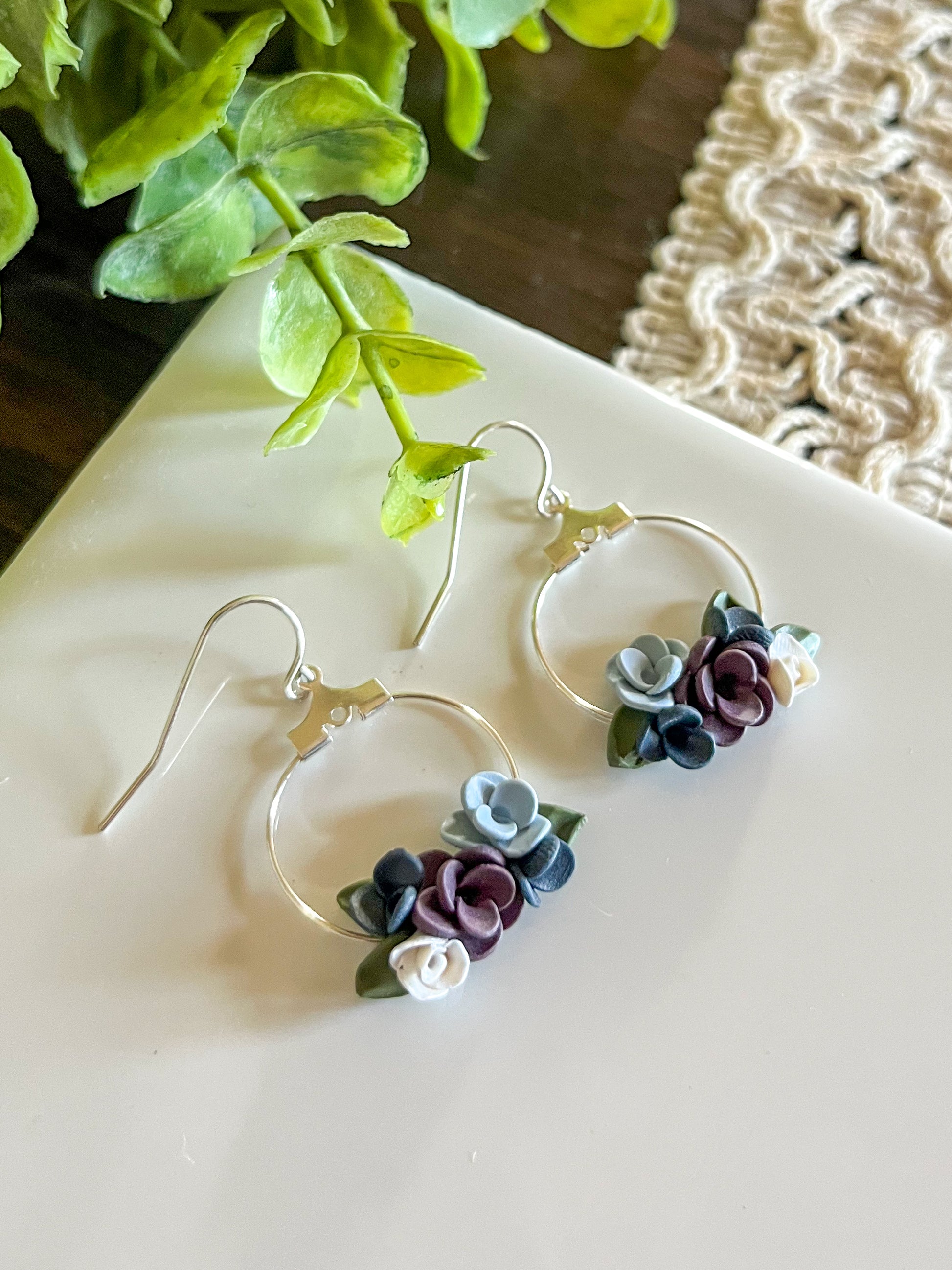 These earrings feature blue and purple flowers on a small gold or silver hoop. They are a stunning, yet small style for anyone who loves these cool tones.