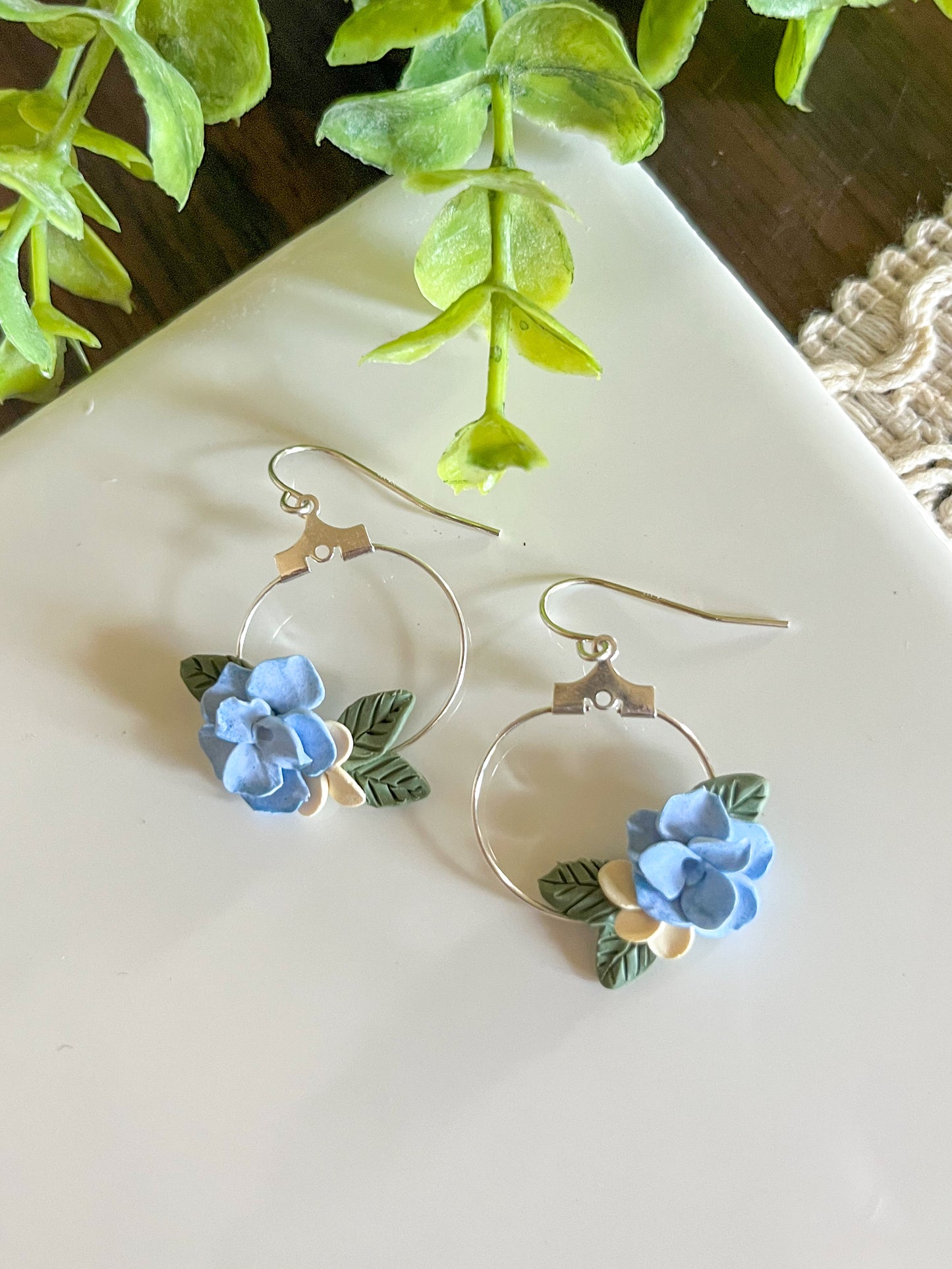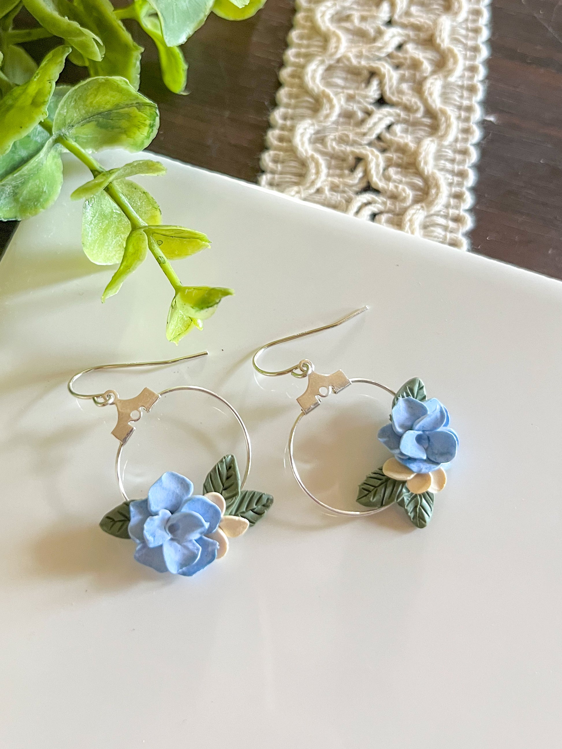 This small and dainty style is a perfect, quieter style for any jewelry collection. They feature white and blue florals on an open silver or gold hoop.