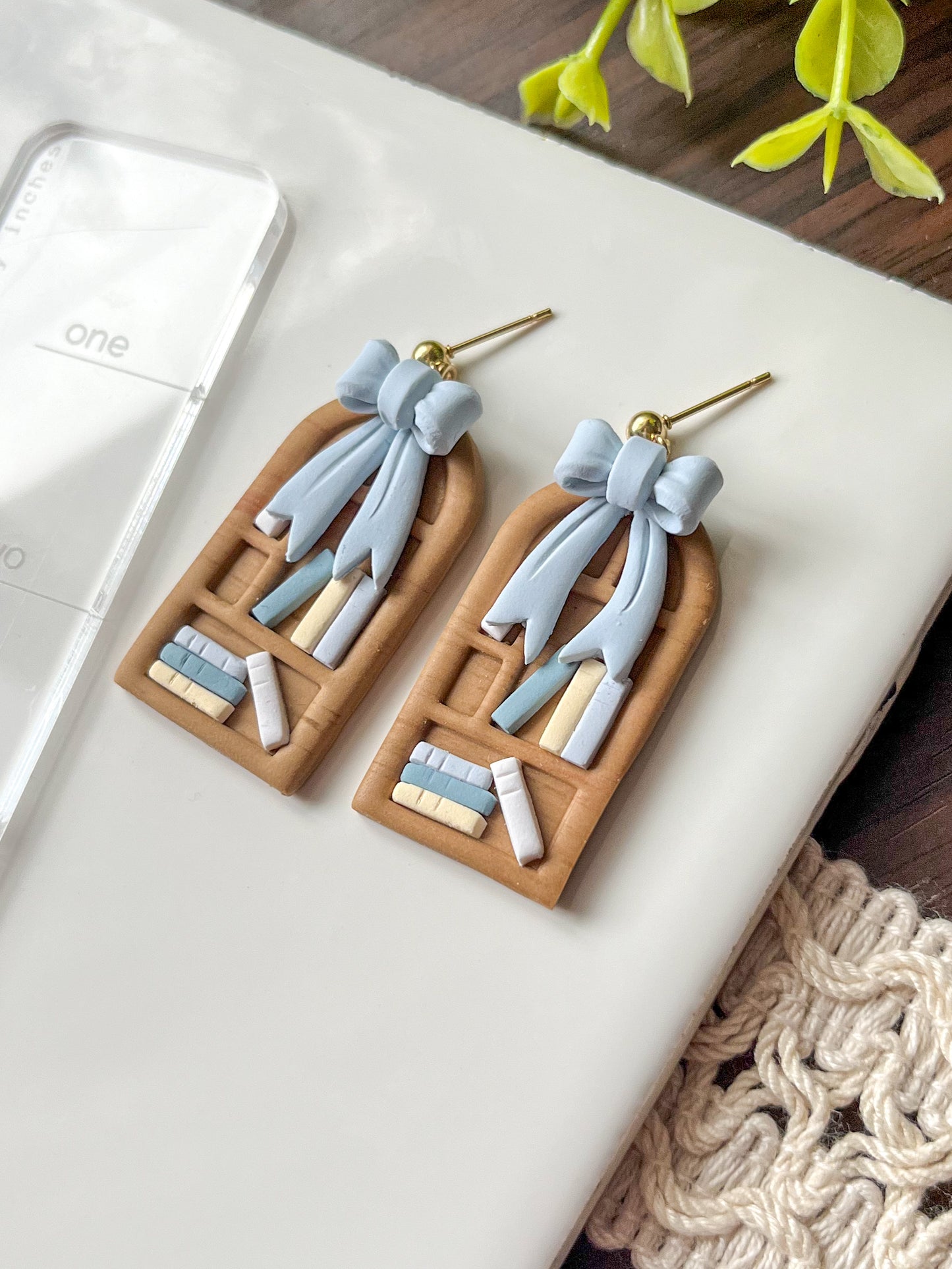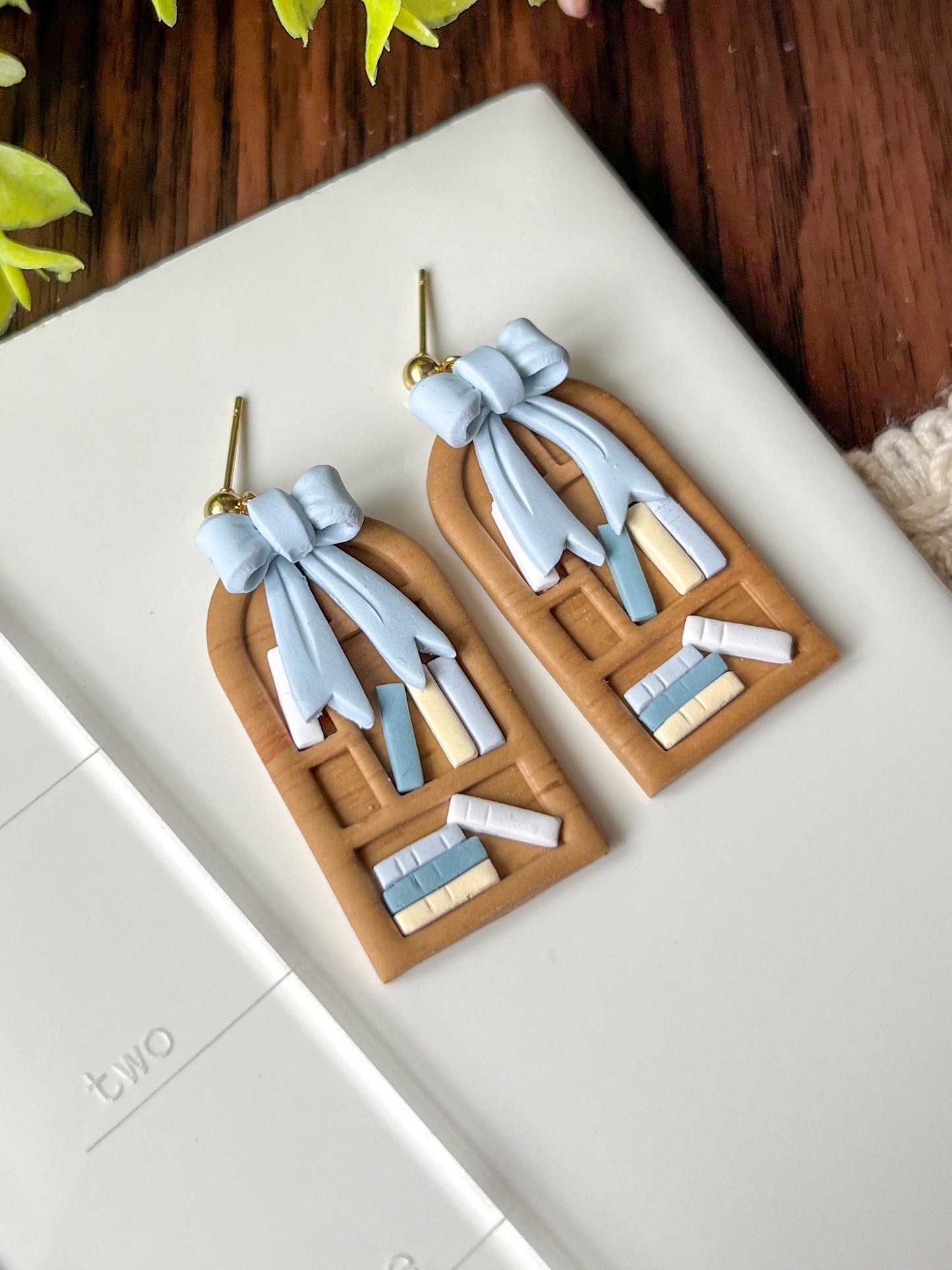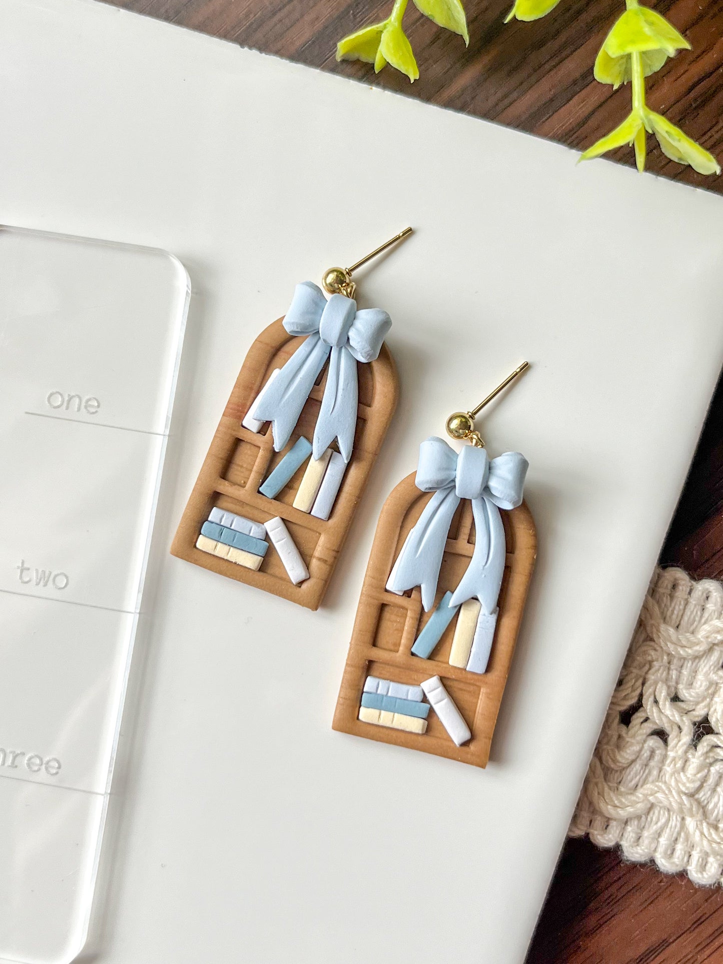 These earrings are 1.5" in length and bring a soft, pastel feeling to the bookish vibe. They are made with several different blue tones and feature a 24k gold plated ball stud finding.