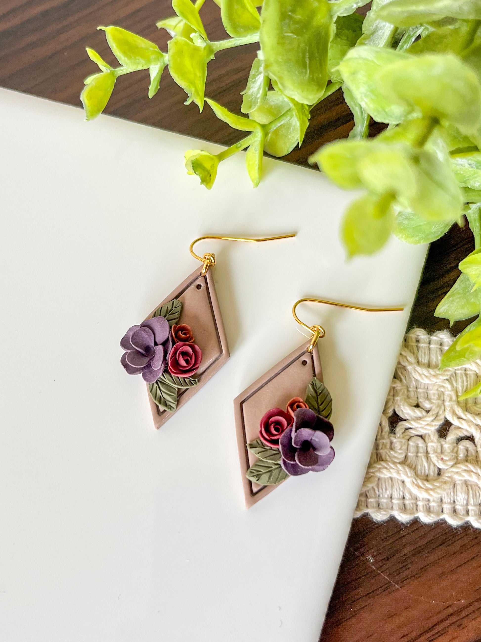 Brown Diamond Earrings with Jewel Tone Florals | 18k gold-plated
