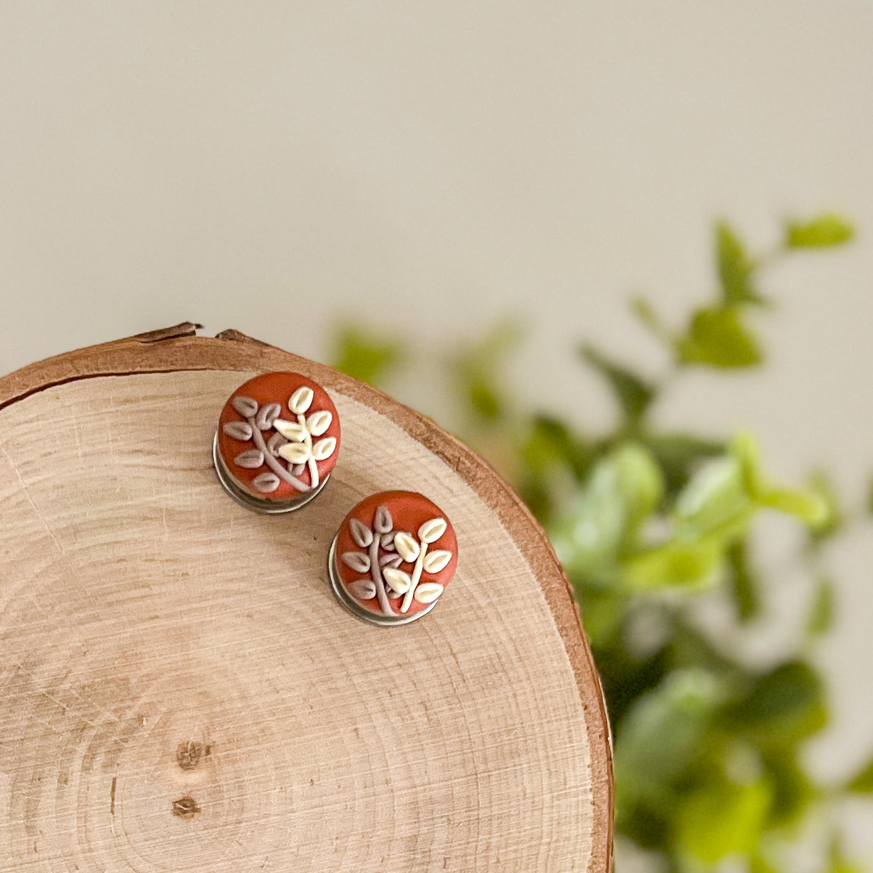 These earrings feature a lovely burnt orange that is accented by the brown and off-white ferns. Each leaf is individually handsculpted to create the overall effect and can be reproduced into a variety of sizes