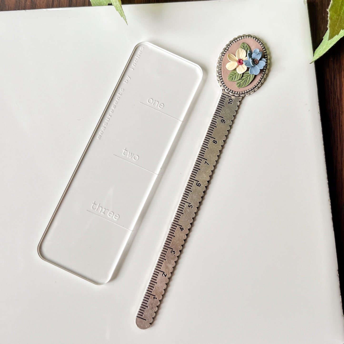 This bookmark features a brown background and a gorgeous blue and white hand-sculpted bouquet. It is the perfect decorative bookmark for all of those readers who want something a little bit beyond a receipt. This style of bookmark also doubles as a 10cm ruler and so is perfect to use as a ruler in your sketchbook as well.