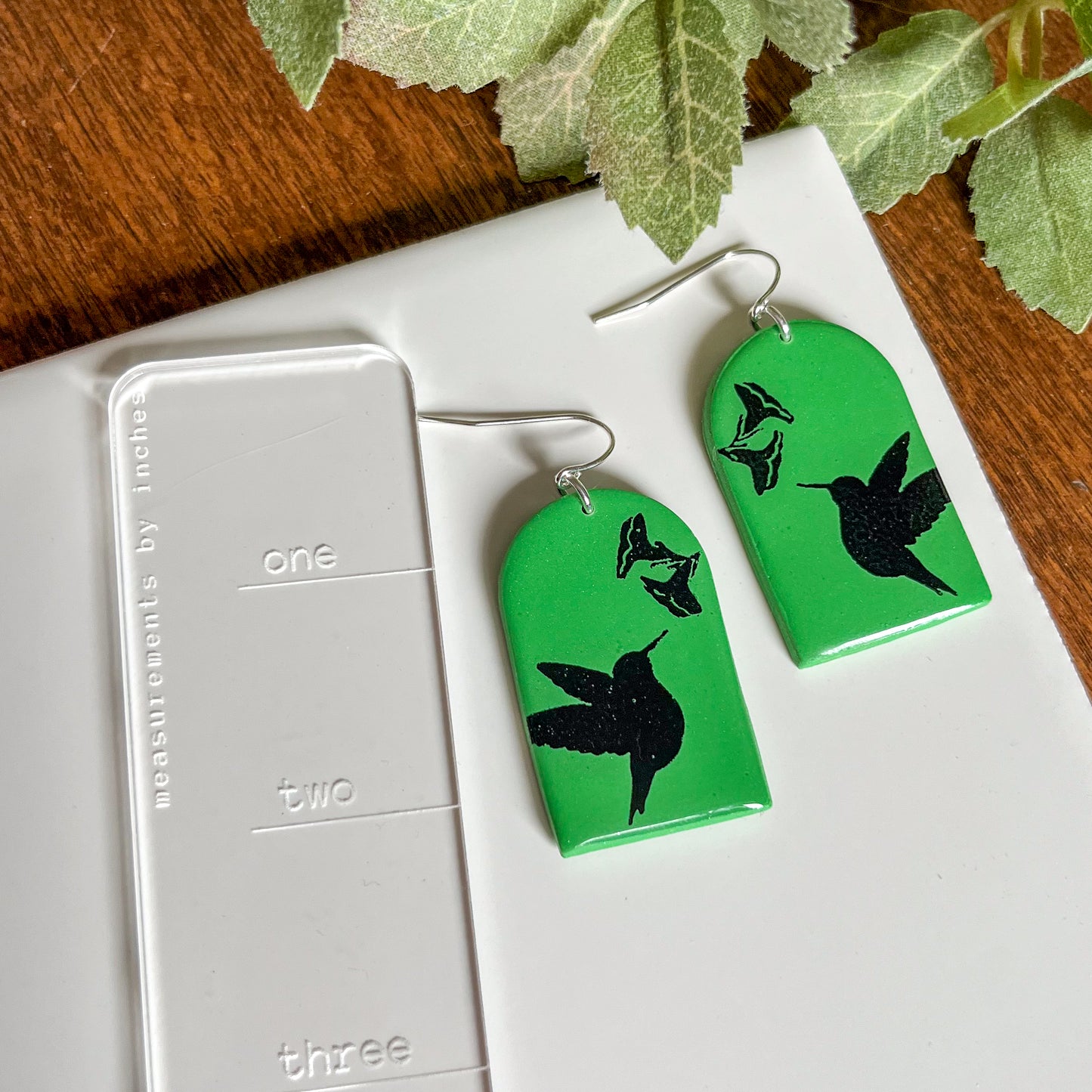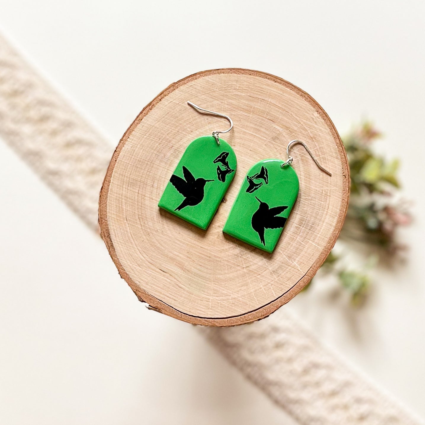 These green hummingbird earrings feature a slight shimmer underneath a high-gloss resin finish. They are made with a high-quality 925 sterling silver finding to ensure all-day comfort. The design found on this pair was made specifically for these earrings.