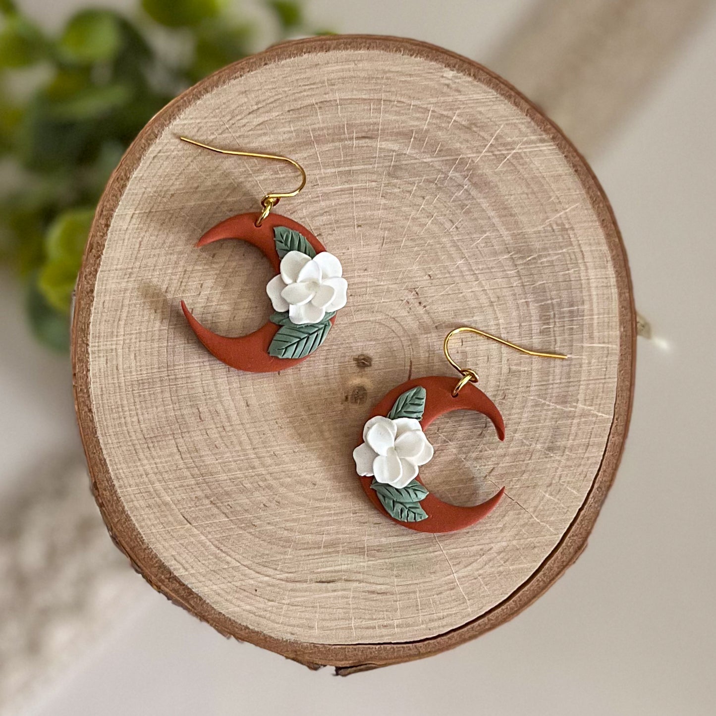 These stunning moon earrings feature an orange base with green botanical details and a delicate white flower. They give a pumpkin vibe, which is perfect for autumn! They are made with an 18k gold-plated hook and are extremely lightweight.