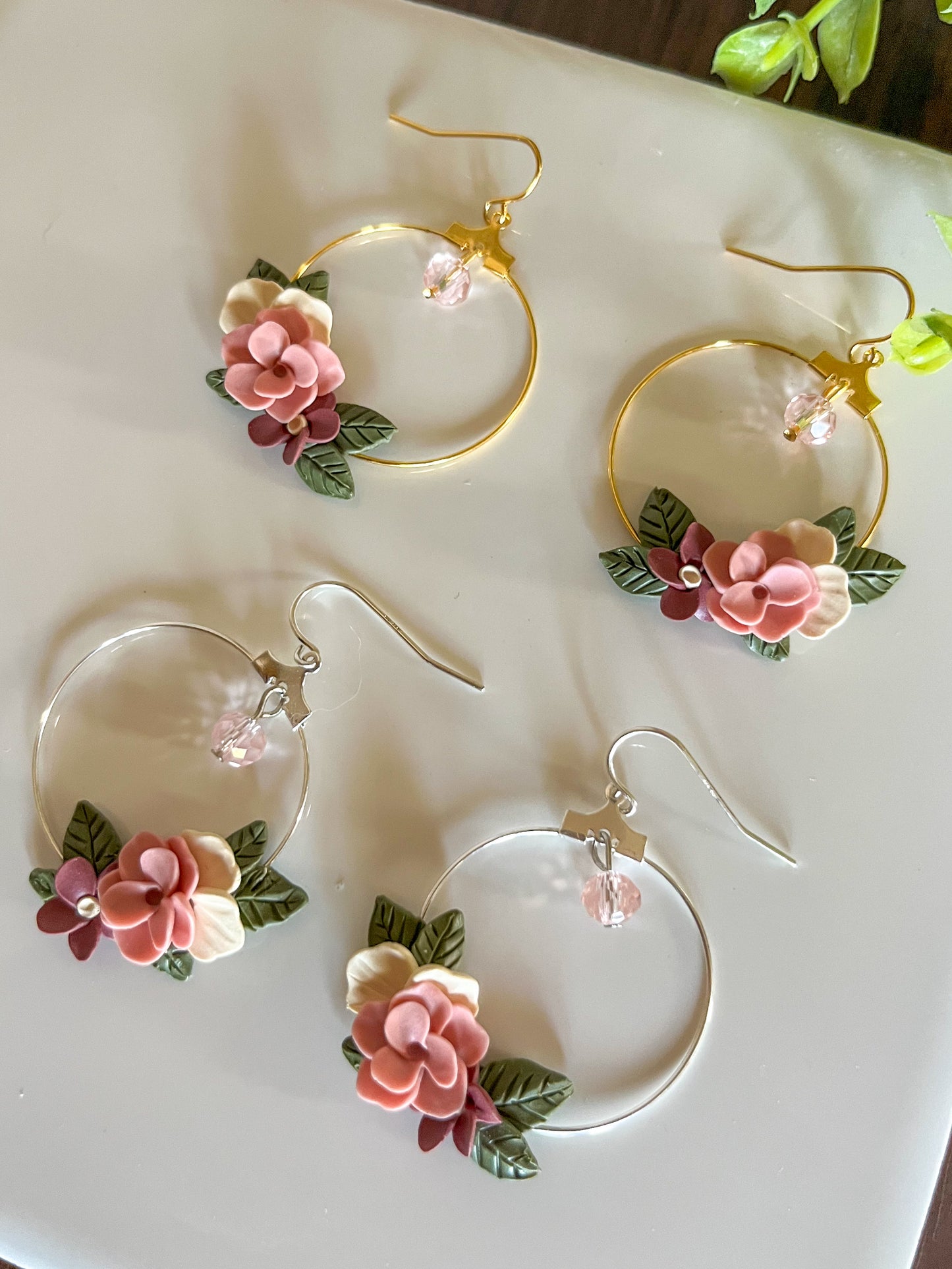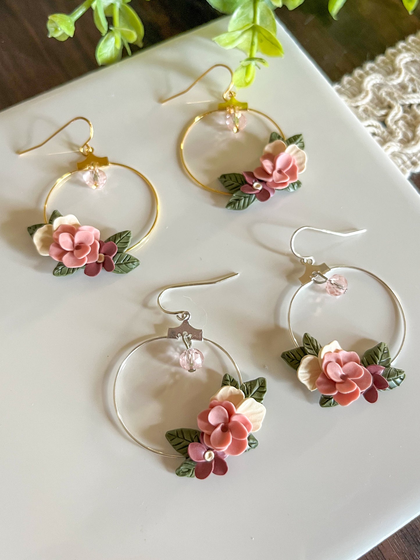 These mid-sized earrings are designed with several softer colors of pink and cream. They are available in both gold and silver for personal style.