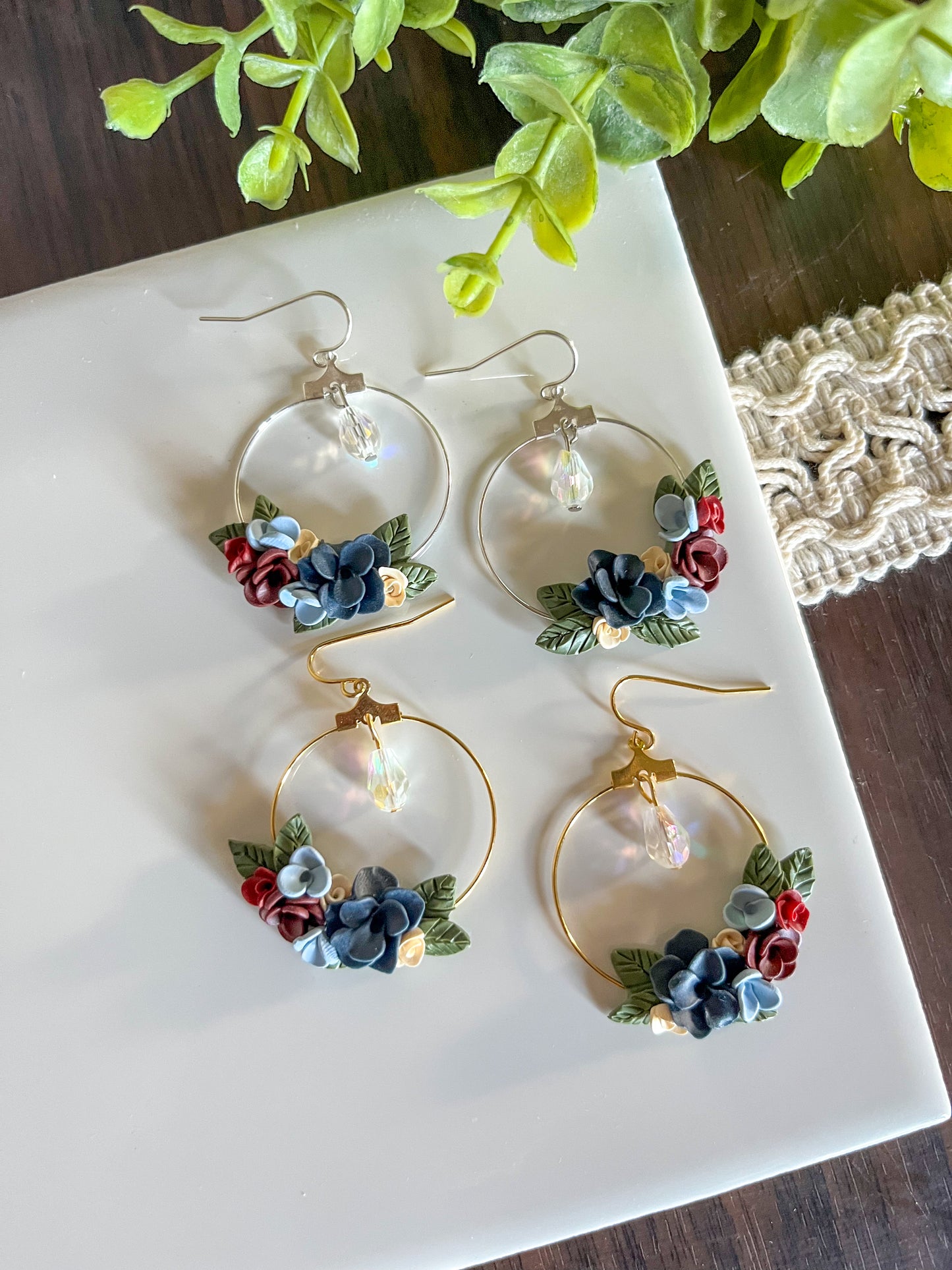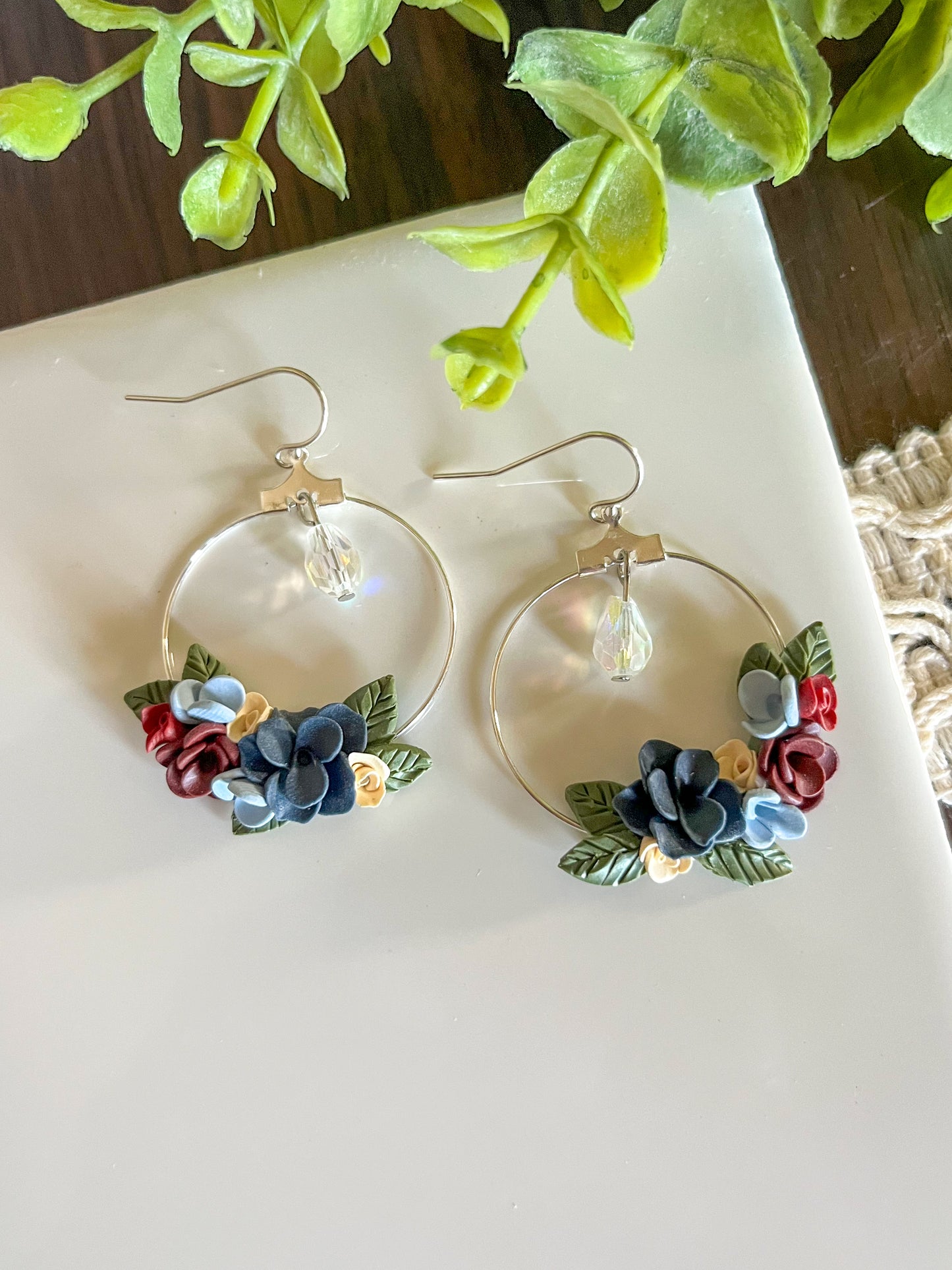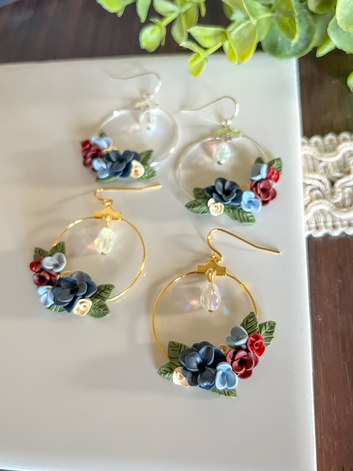 These earrings are perfect for someone who wants a red, white, and blue color palette without super bold colors. They feature red, white, and blue florals on an open silver or gold hoop.
