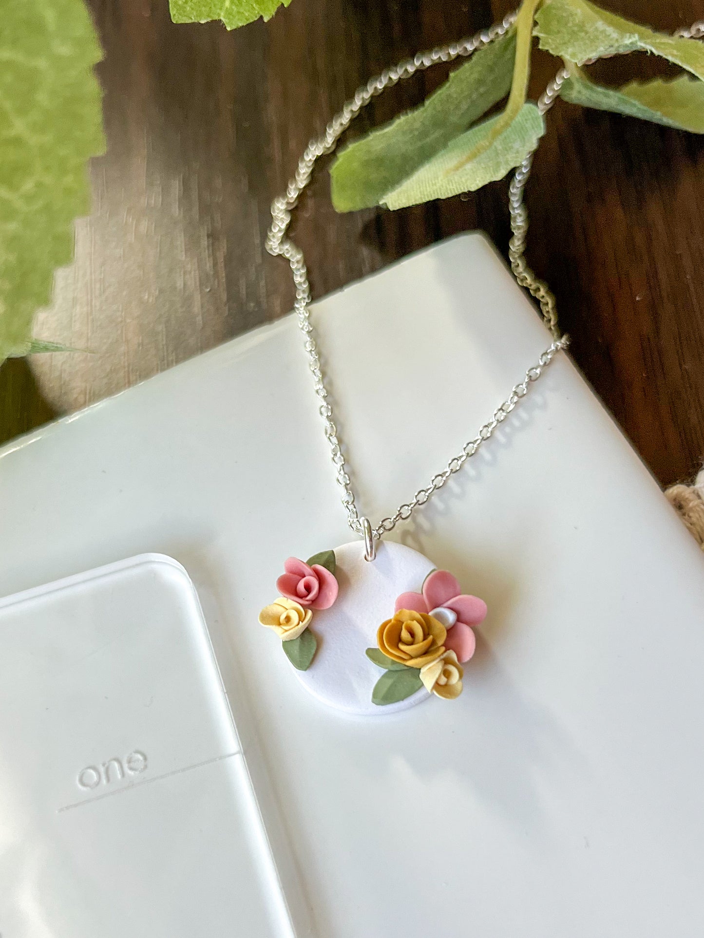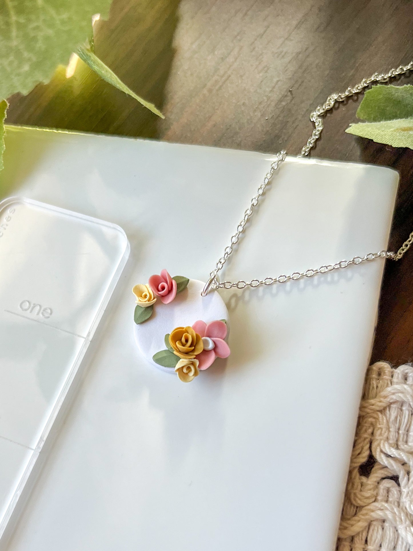 Small white medallion necklace with pink and yellow flowers | multiple metals