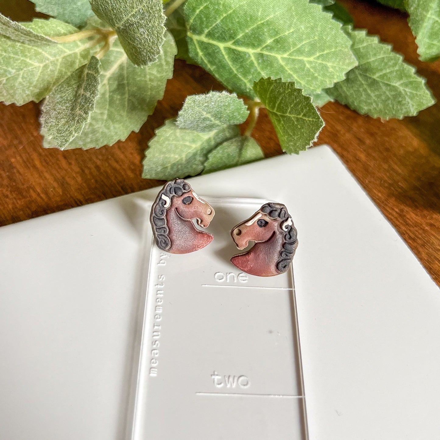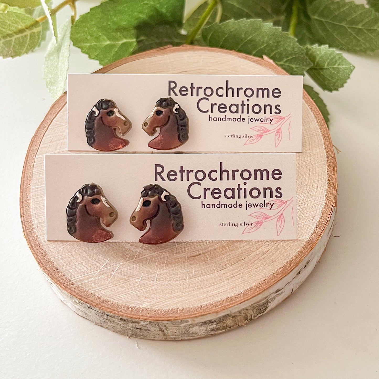 These cute horse earrings are designed after a stunning gypsy vanner from New Mexico. They feature her deep brown color and white blaze. This style is made as a stud with sterling silver findings.