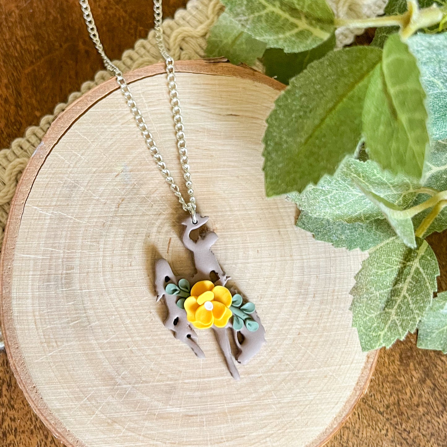 This brown steamboat necklace features a yellow flower and is the perfect piece to share your poke’s pride.